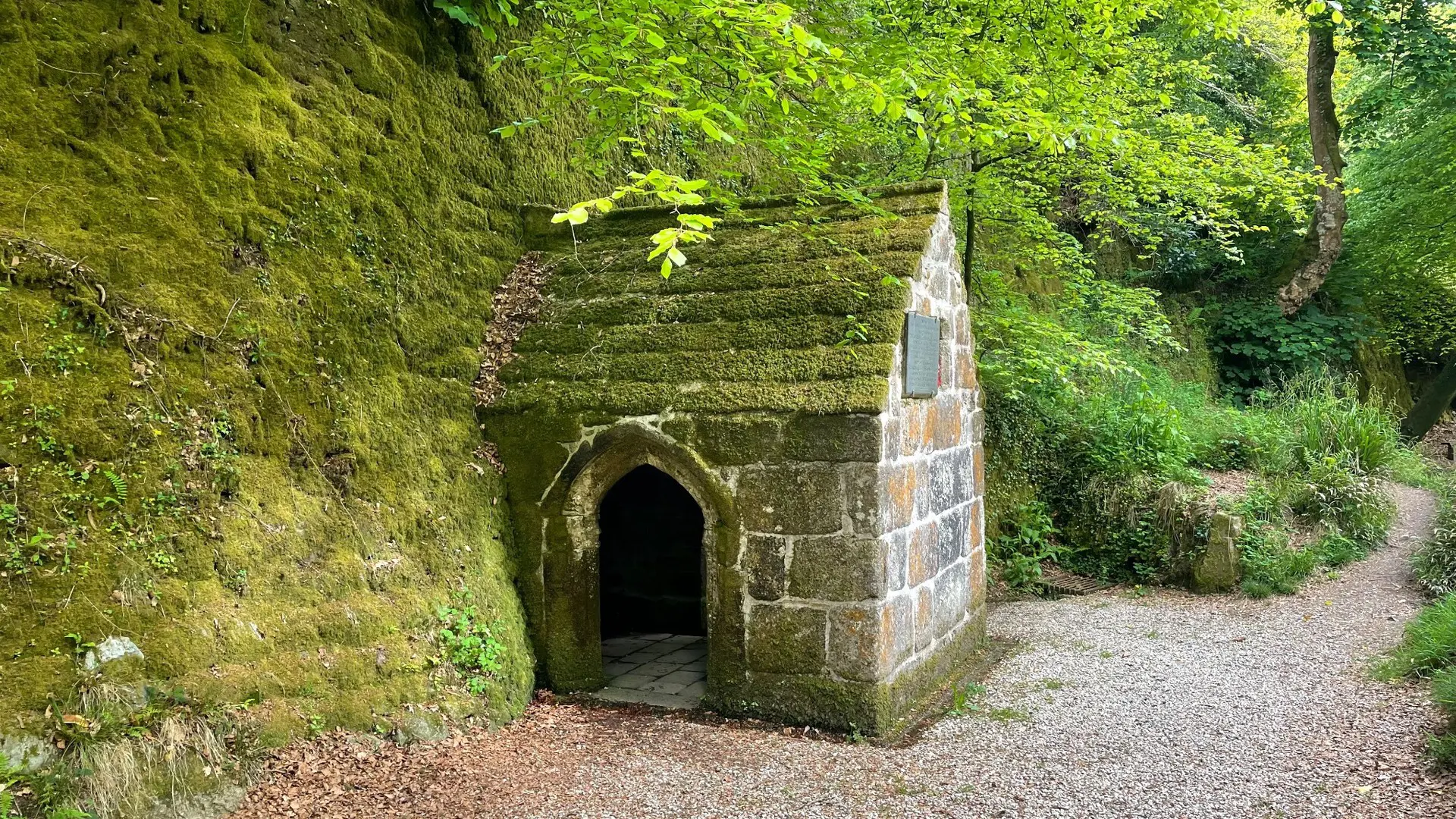 De bemoste kapel, de rotswanden en de stromende bron van Menacuddle Well vormen een zeldzaam middeleeuws monument in de buurt van St Austell.
