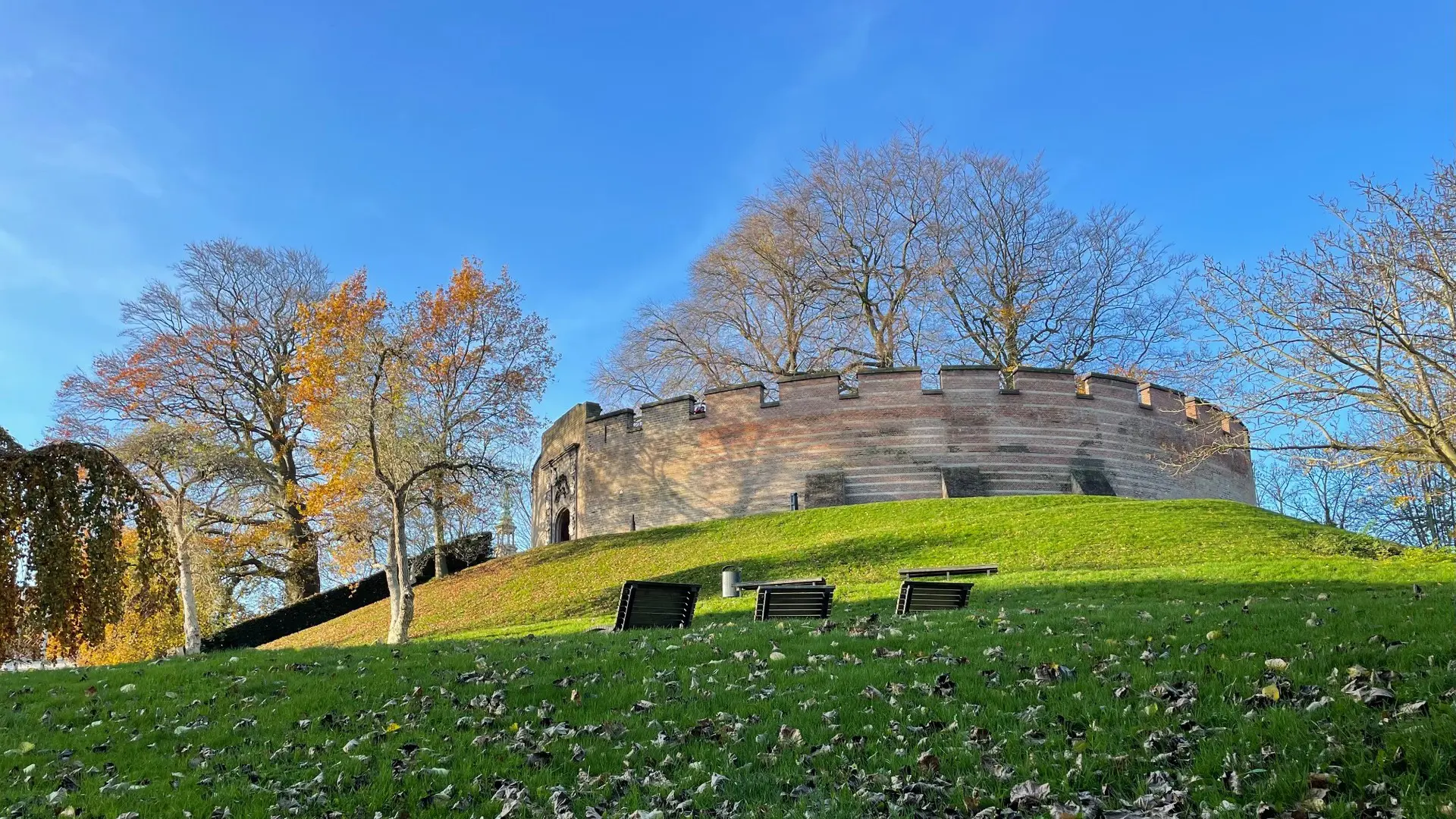 Deze ronde stenen burcht staat boven op een kunstmatige heuvel, een zogenoemde motte, op de plek waar de Oude Rijn en de Nieuwe Rijn samenkomen. De dikke verdedigingsmuren en de hoge ligging bieden uitzicht over het historische centrum, omgeven door bomen en wandelpaden. Hoewel de oorspronkelijke gebouwen binnen de muren verdwenen zijn, staat de buitenmuur nog altijd overeind, bekroond met kantelen en een toegangspoort. De groene hellingen rondom trekken vaak gezinnen en studenten aan. In de directe omgeving liggen bekende plekken zoals de zeventiende-eeuwse Hooglandse Kerk en de levendige Burgsteeg, die de burcht verbindt met de levendige sfeer van de stad.