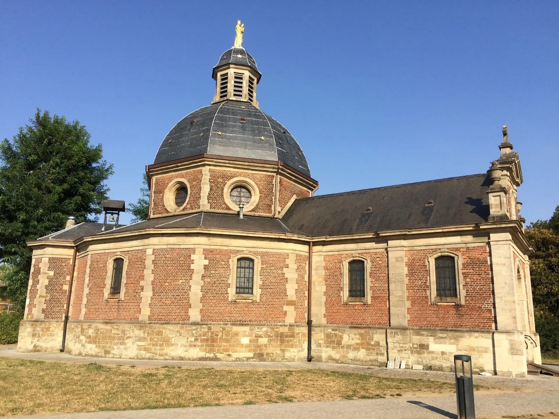 The current chapel was constructed in 1906 in the neobaroque style by architect A. Vandamme, replacing an earlier chapel dating from the 17th century. Built mainly from locally sourced brick, the chapel is shaped as an irregular heptagon topped with a dome-like roof. The location has a long-standing history as a site of Christian worship, with records noting the presence of a hermitage there as far back as 1294. Over time, numerous ex-votos, small tokens and plaques expressing thanks left by worshippers, have accumulated inside. The surrounding Oudenberg area has been protected as a landscape since 1940 and gained official monument status in 1995, reflecting its cultural and environmental value.