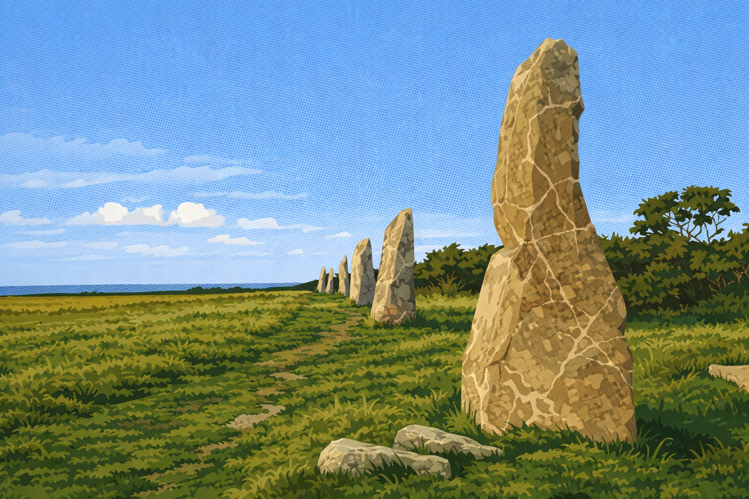 De Nine Maidens stone row, bestaande uit granieten megalieten in een ongerept natuurlandschap, verweeft prehistorische mystiek met het ruige landschap van Cornwall.